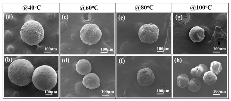 然而,当温度超过60°C时,微球的形状开始出现轻微变形,且在100°C时,微球的形状明显失去球形。这表明过高的温度可能会对微球的均匀性和形态产生负面影响。因此,维持一个优化的反应温度对于最大化电活性相的含量,同时保持PVDF微球的结构完整性至关重要。