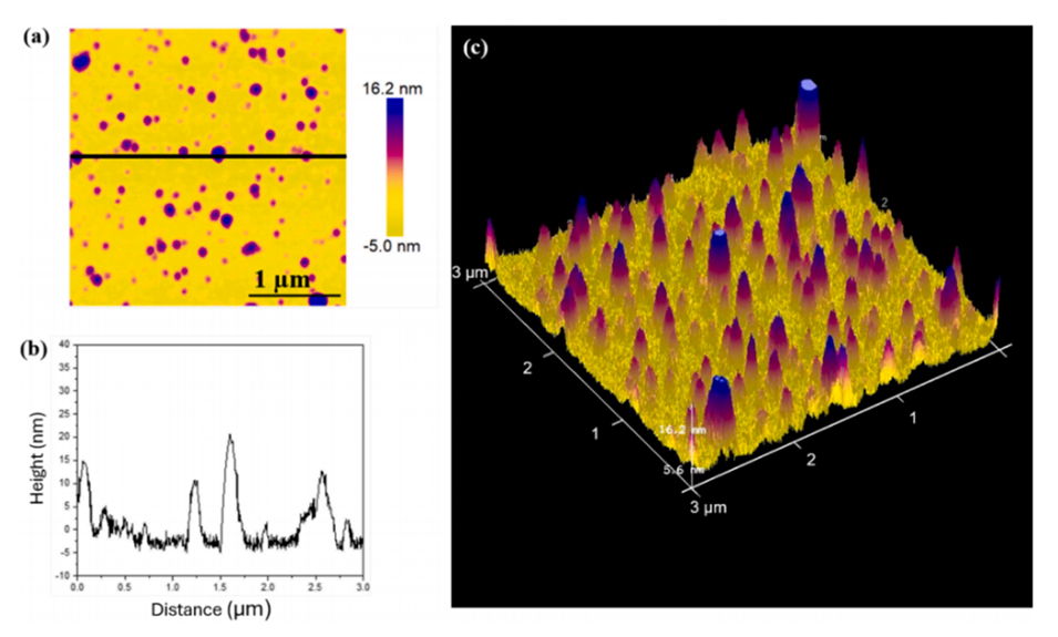 图12.(a)样品编号为100-5-60的PVDF微球的AFM形貌图像和相应的(b)线(高度)轮廓,以及(c)3D AFM形貌图像。(扫描面积:3µm×3µm)。