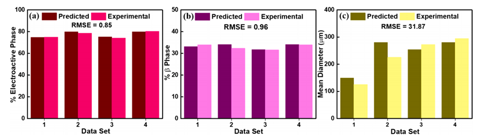 图15.比较了实验观察值和通过决策树回归算法获得的预测值之间的相关性,包括(a)总电活性相的分数,(b)β相的分数和(c)PVDF微球的平均直径。
