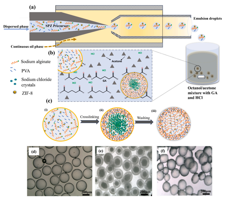 1、本研究采用微流控技术合成了由海藻酸钠(SA)、聚乙烯醇(PVA)和沸石咪唑框架-8(ZIF-8)组成的分级多孔复合微凝胶(SPZ微凝胶)。