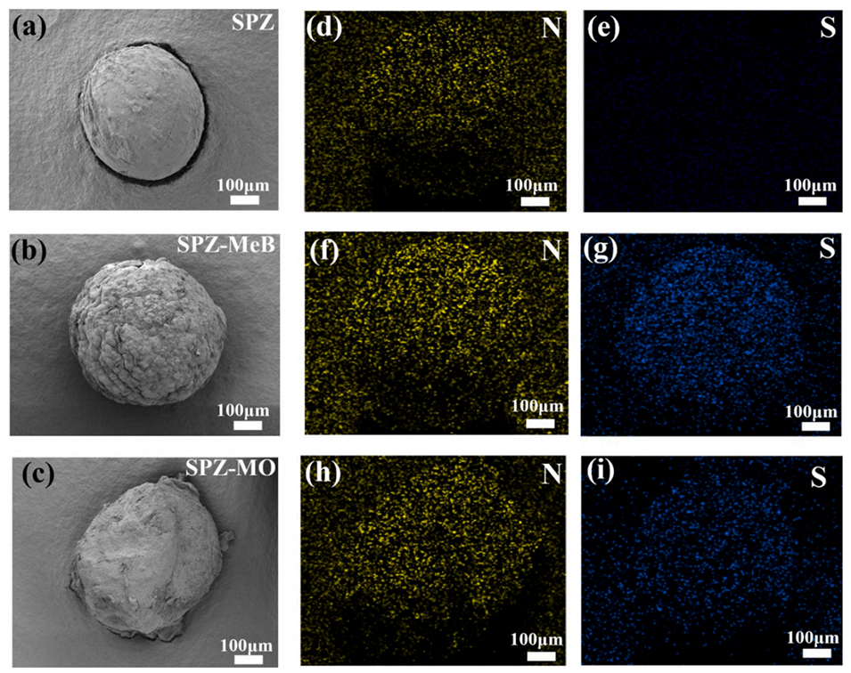 图5.(a)吸附前以及(b)MeB和(c)MO吸附后SPZ微凝胶的SEM分析。(d,e)吸附前以及(f,g)MeB吸附后和(h,i)MO吸附后,微凝胶中N和S元素的EDS映射图像。
