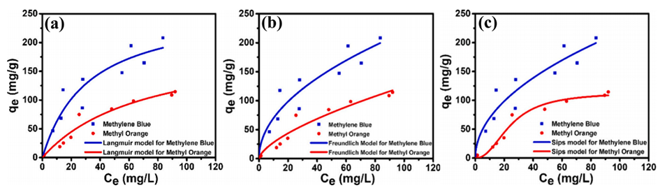 图8.MeB和MO在SPZ微凝胶上的吸附等温线模型:(a)Langmuir等温线模型和(b)Freundlich等温线模型以及(c)Sips模型(染料浓度范围:100-500mg/L,pH:6,剂量:0.02g,室温,180分钟)。