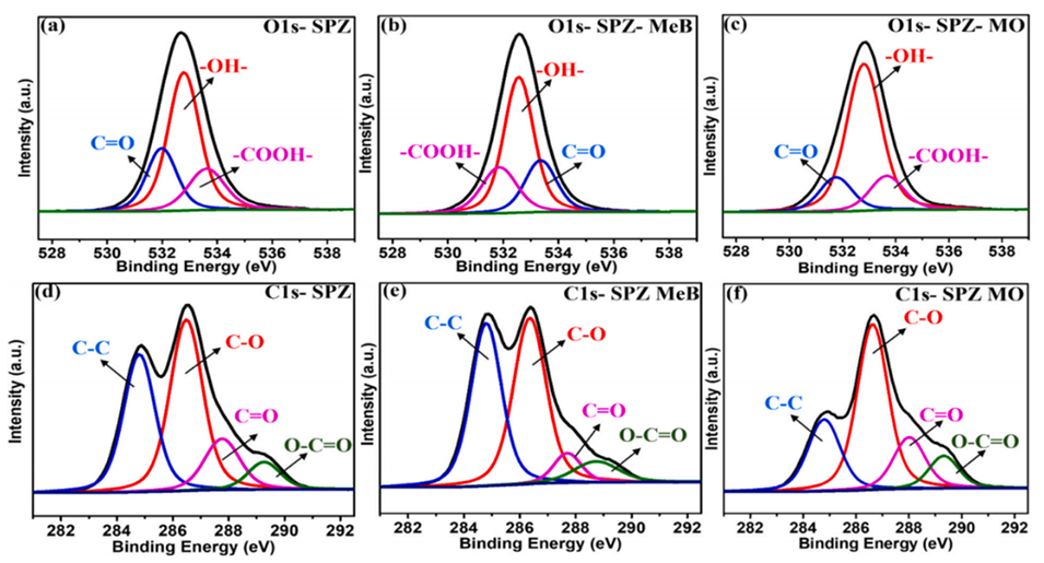图6.SPZ微凝胶的O1s和C1s XPS光谱:(a,d)吸附前和(b,e)MeB吸附后,(c,f)MO吸附后。