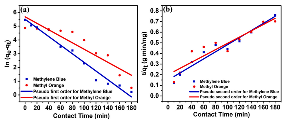 图9.SPZ微凝胶吸附MeB和MO的动力学模型拟合:(a)伪一级模型和(b)伪二级模型(初始染料浓度:500mg/L,pH:6,剂量:0.02g,室温)。