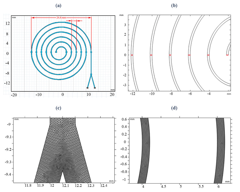 图2.a)螺旋微流体装置几何形状,b)定义了每个环路的分析线,c)入口以及d)第四和第五环路的网格划分。