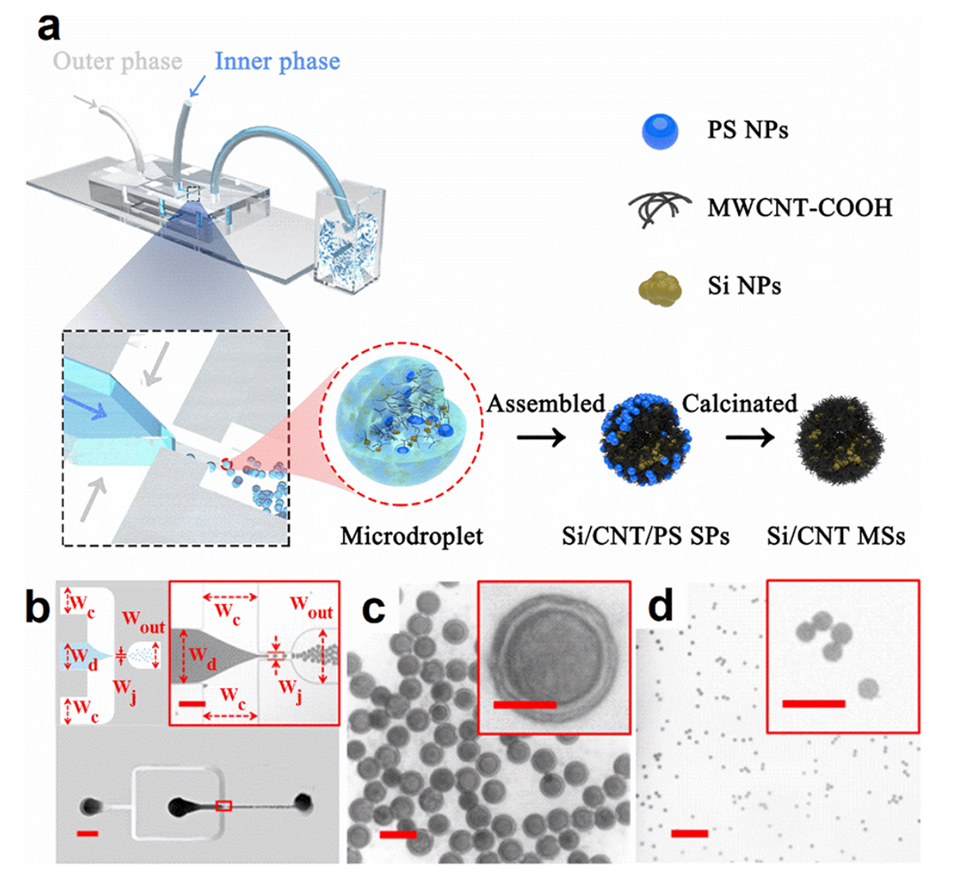 图1.(a)Si/CNT MSs制造过程的3D图示。(b)流动聚焦微流体装置的示意图和光学显微图像。(c)产生的微滴的光学图像;图像和插图的比例分别为200和50μm。(d)干燥微滴的光学图像;图像和插图的比例分别为200和50μm。