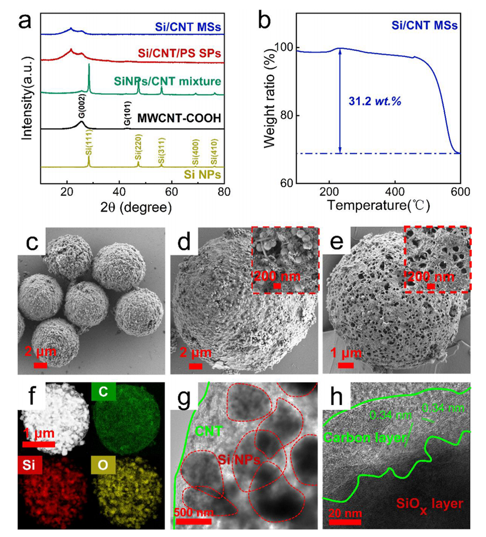 图3.(a)Si/CNT/PS SPs、Si/CNT MSs、CNT-COOH和Si NPs的XRD图谱。(b)Si/CNT MSs的TG曲线。(c)Si/CNT/PS SPs、(d)Si/CNT/PS SP和(e)Si/CNT MS的SEM图像,插图显示相应精细结构的放大区域。(f)Si/CNT MS的暗场扫描透射电子显微镜(DF-STEM)图像和EDS元素图。(g)放大的TEM图像揭示了Si/CNT MS中的Si NPs和CNT分布。(h)高分辨率透射电子显微镜(HRTEM)图像显示了Si/CNT MS的SiOx和CNT界面处的良好晶体结构。