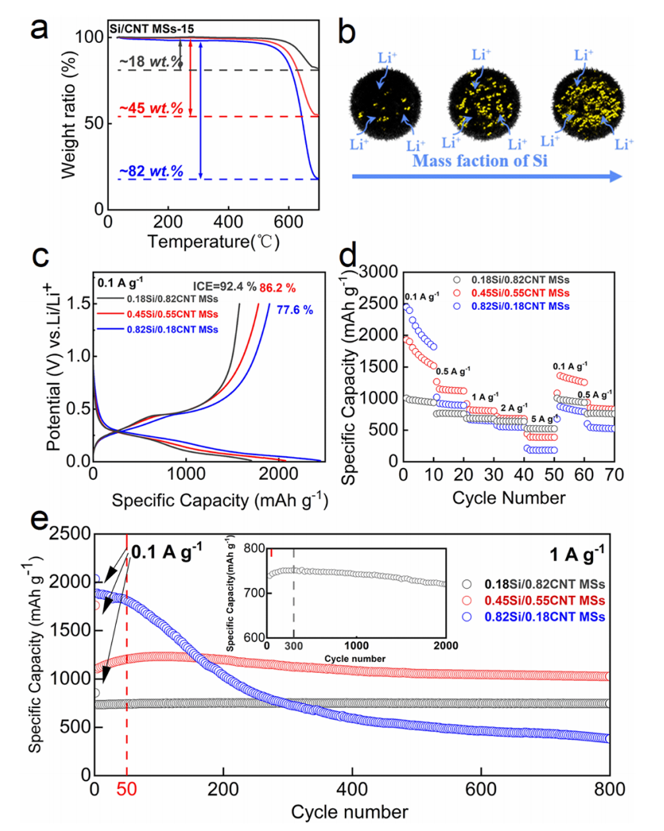 图6.(a)0.18Si/0.82CNT MSs、0.45Si/0.55CNT MSs和0.82Si/0.18CNT MSs的TG曲线。(b)0.18Si/0.82CNT MSs、0.45Si/0.55CNT MSs、0.82Si/0.18CNT MSs电极中的锂化过程示意图。0.18Si/0.82CNT MSs、0.45Si/0.55CNT MSs和0.82Si/0.18CNT MSs的电化学性能比较:(c)0.1 A g-1下的第一次循环充放电曲线,(d)0.1至5 A g-1的倍率性能,以及(e)1 A g-1下的循环性能(从第2次循环到第500次循环),插图显示了0.82Si/018CNT MSs在1 A g-1下从第2次循环到第2000次循环的循环性能。