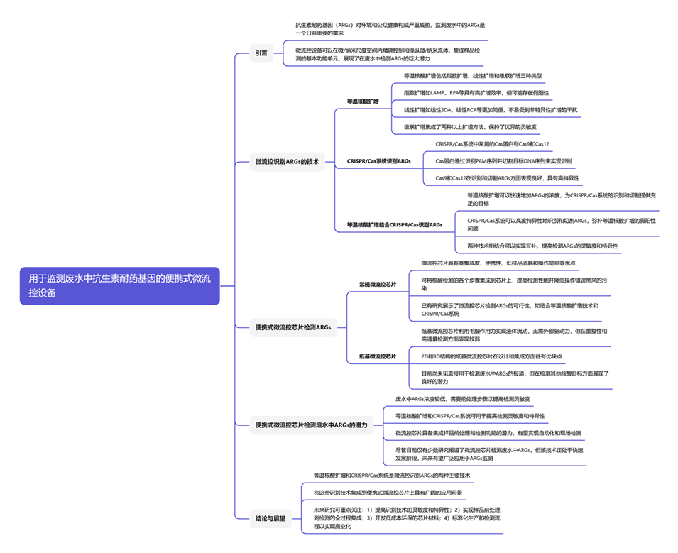 抗生素耐药基因(ARGs)对环境和公共健康构成严重威胁,而废水是ARGs的重要来源,因此对其监测需求日益增长。微流控设备通过在微/纳米尺度空间内精确控制和操作流体,可集成样品检测的基本功能单元,在废水中ARGs的检测方面展现出巨大潜力。