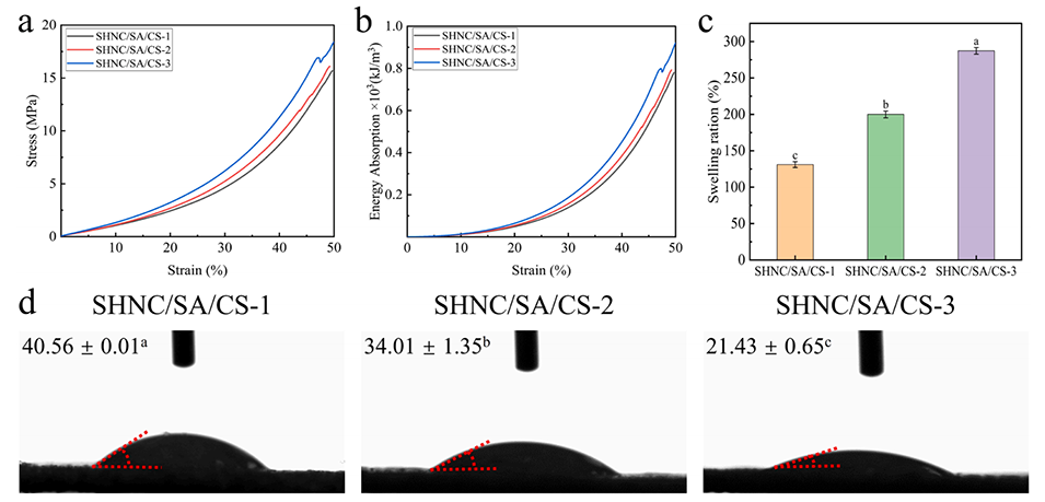 2、SHNC/SA/CS水凝胶微球具有优异的韧性(18.67 MPa)和亲水性(接触角21.43°±0.65°),提升了再利用率,且富含羟基、羧基和氨基等螯合基团,显著提高了吸附效率。