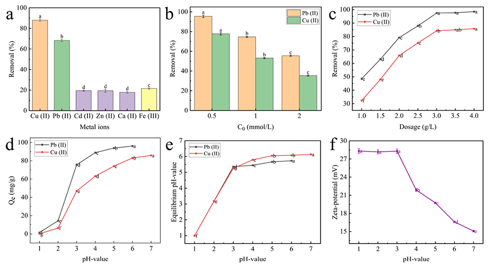 图4.(a)壳聚糖基水凝胶微球对六种金属离子的去除率。(b)壳聚糖基水凝胶微球在二元体系中对Pb(II)和Cu(II)的去除率。(c)壳聚糖基水凝胶微球用量对Pb(II)和Cu(II)去除率的影响。(d)吸附溶液pH值对Pb(II)和Cu(II)去除率的影响。(e)吸附溶液的平衡pH值。(f)壳聚糖基水凝胶微球在不同pH值溶液中的ζ电位。数据以平均值±标准差表示。不同字母表示显著差异(P<0.05)。每个实验重复三次。
