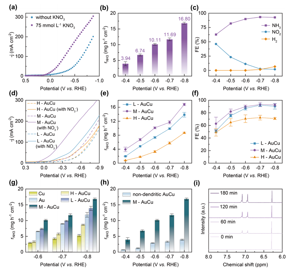 电催化硝酸盐还原反应(NitrRR)是将硝酸盐转化为氨的重要过程,对于清洁氨的生产具有重要意义。然而,该反应涉及复杂的八电子转移过程,导致反应选择性和动力学性能不佳,限制了其应用。近年来,树枝状金属合金作为高效催化剂受到了广泛关注,其中AuCu合金因其优异的电子和离子导电性而被认为具有很大的应用潜力。然而,目前在AuCu合金的制备过程中,还存在结构调控难度大和反应增强机制不明确等挑战。因此,开展高效、可控的合成策略以优化AuCu纳米材料的性能,对于提高NitrRR的催化效率至关重要。