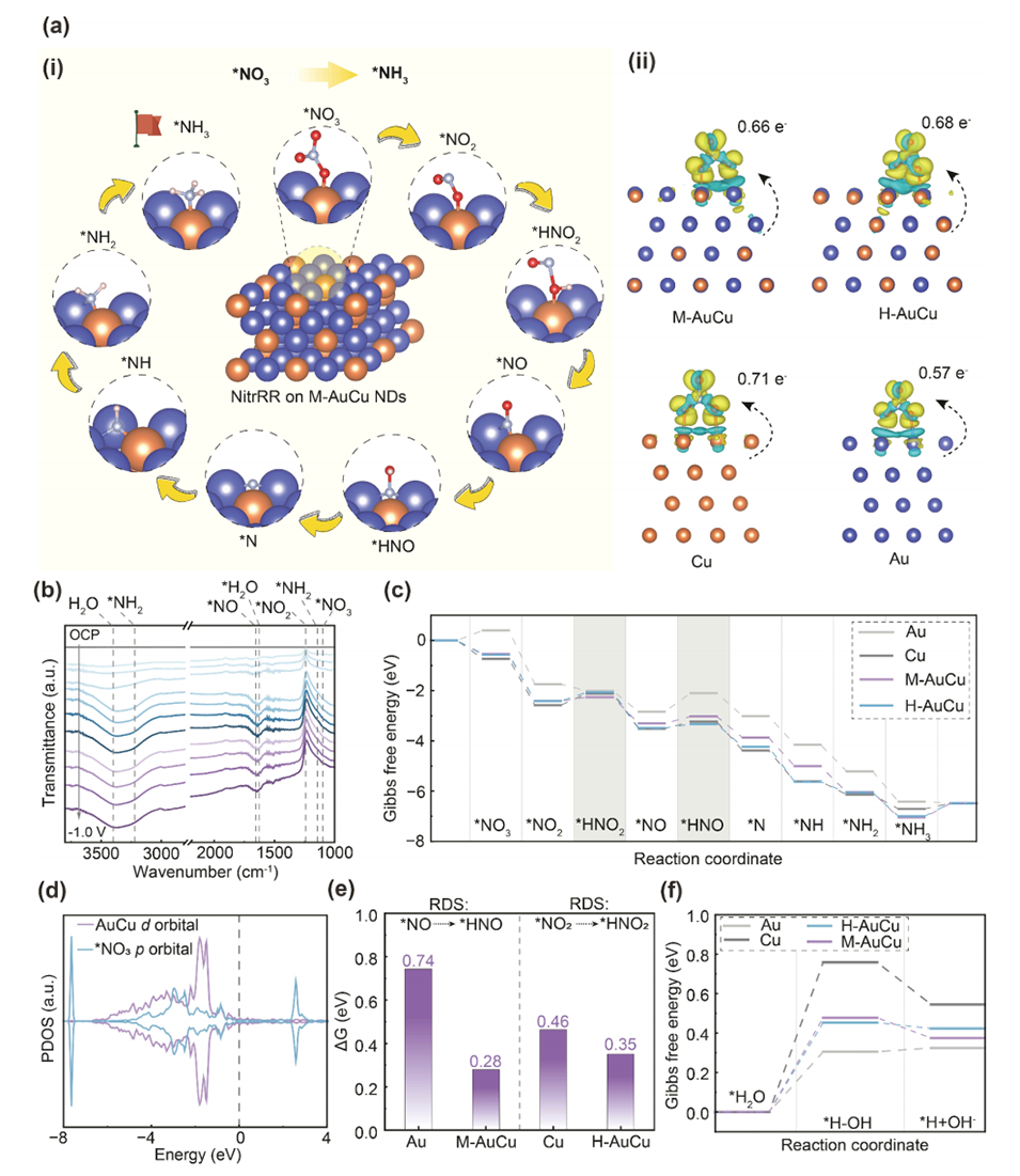 3、优化的反应路径:DFT计算表明,Au3Cu1位点显著降低了速率决定步骤的能垒(0.28 eV),促进了硝酸盐的还原反应。