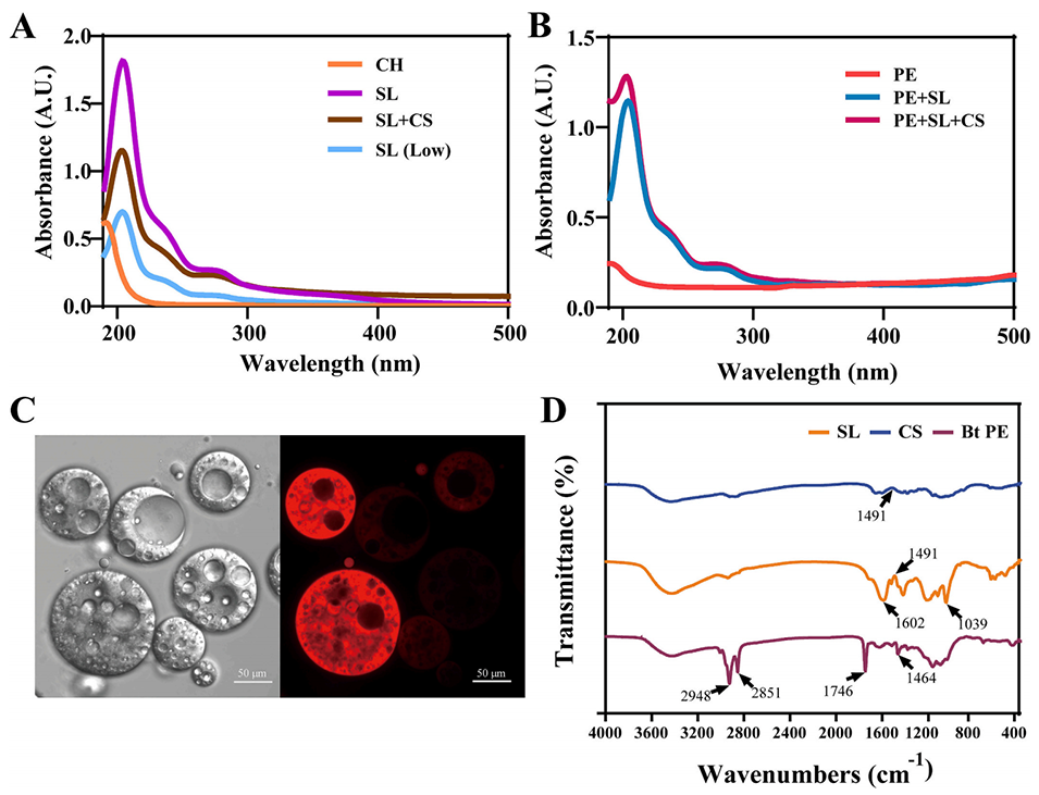 微胶囊的壳层由壳聚糖和木质素磺酸钠组成。壳聚糖的氨基在pH调节下发生去质子化,形成带正电的纳米颗粒,随后与带负电的木质素磺酸钠通过静电吸附相互作用,形成稳定的壳层。这种结构赋予微胶囊良好的机械和化学稳定性,从而有效保护内部的活性成分(如Bt细菌和孢子)免受外界环境的影响。