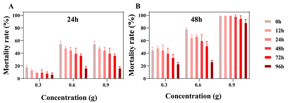 图8.微胶囊生物测定。24h(A)和48h(B)时不同浓度微胶囊处理的幼虫死亡率。