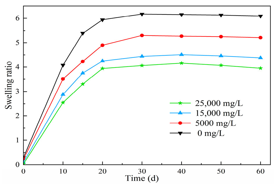 图12.不同盐度对聚合物微球膨胀性能的影响。