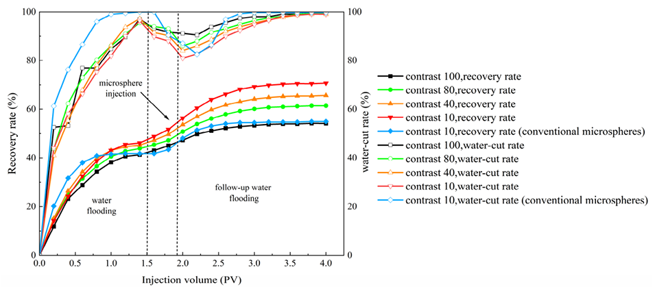 图17.不同注入量的自胶结聚合物微球和常规微球在驱替过程中的采收率和含水率变化。