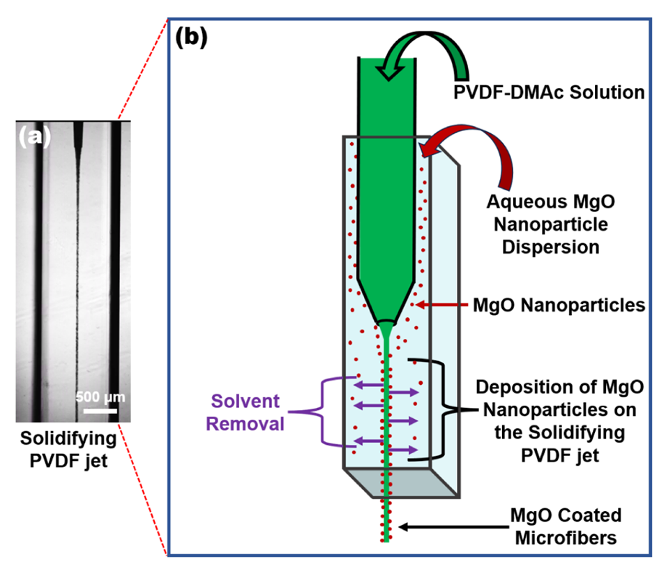 图2.基于单步微流控技术制备纳米颗粒涂覆聚合物微纤维。(a)在内部圆柱形玻璃毛细管尖端产生的PVDF溶液射流的显微图,该毛细管同轴放置在承载外部共流MgO纳米颗粒水相分散液的方形玻璃通道内。(b)微流控装置的示意图显示了纳米颗粒同时沉积在通过溶剂蒸发固化的纤维表面上。