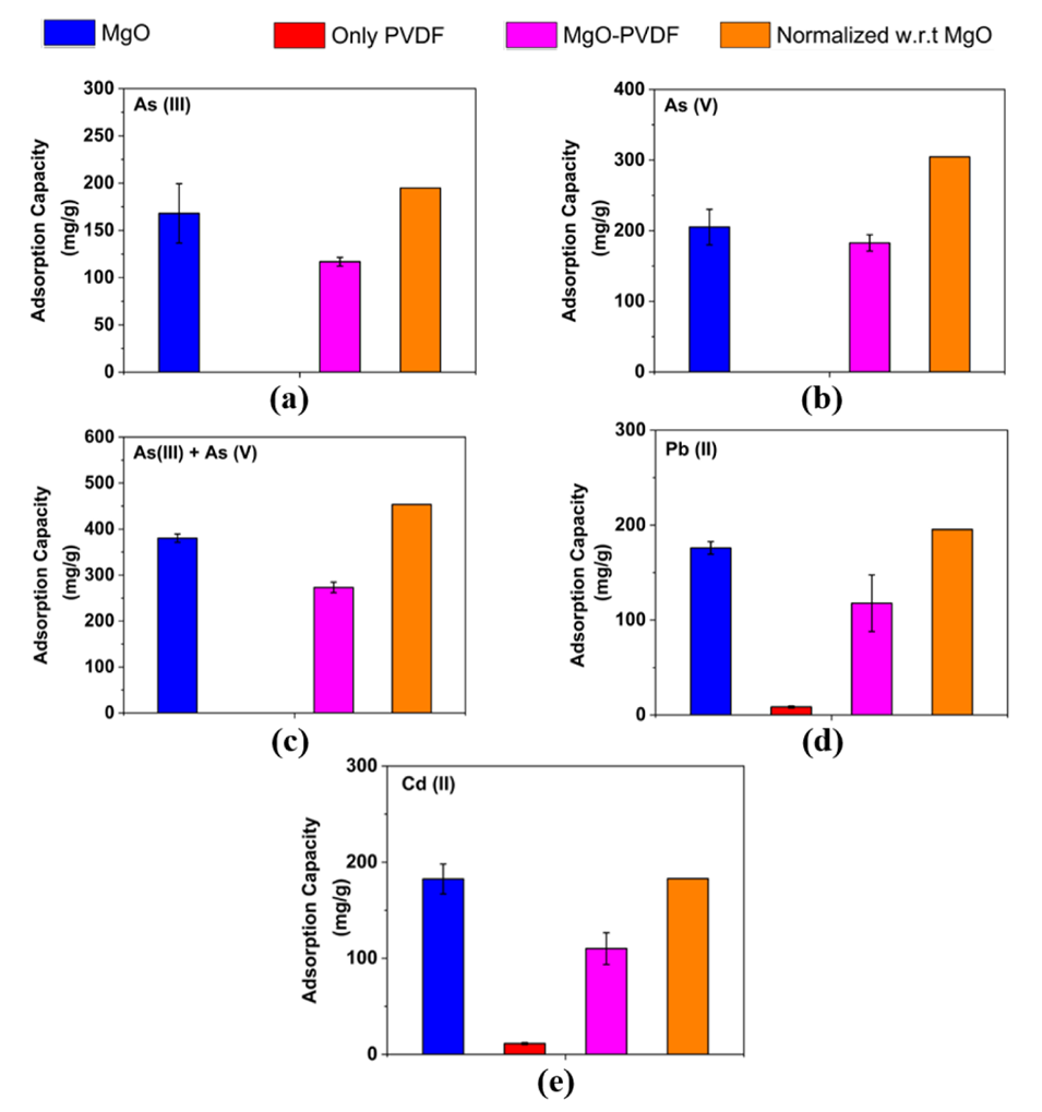 图8.仅MgO、仅PVDF和MgO纳米颗粒涂覆PVDF纤维对(a)仅As(III)、(b)仅As(V)、(c)As(III)+As(V)组合、(d)仅Pb(II)和(e)仅Cd(II)的吸附能力。