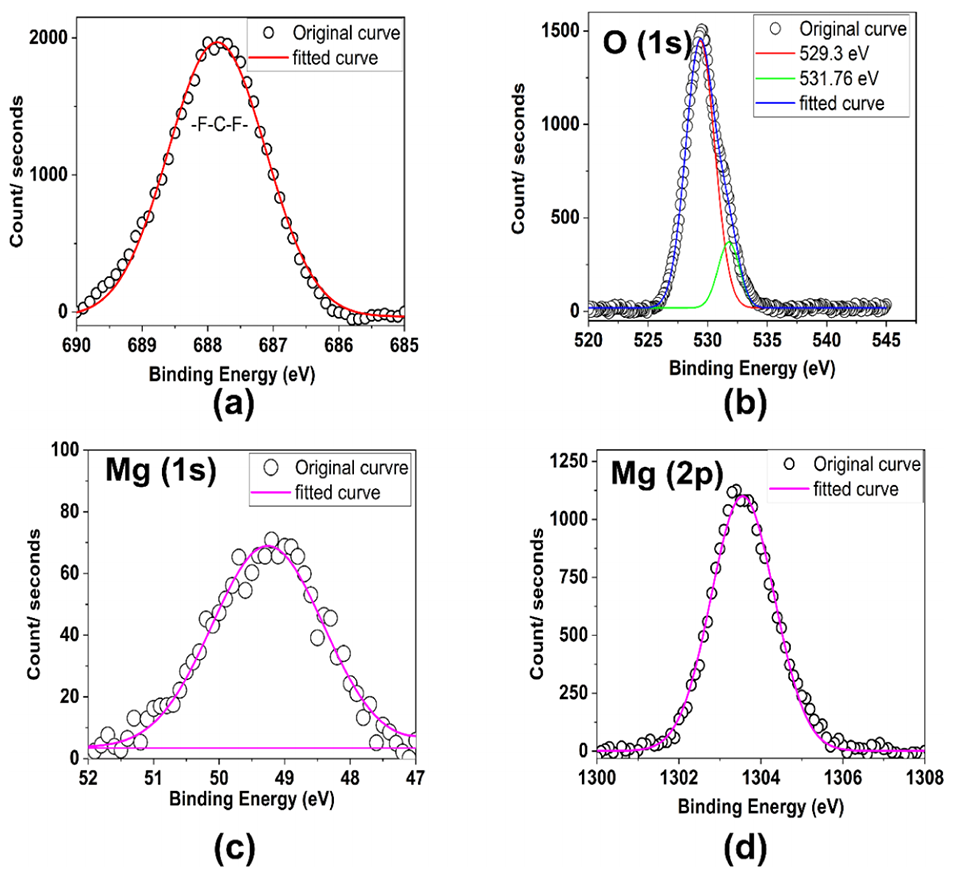 图7.MgO纳米颗粒涂覆PVDF纤维的(a)F(1s)、(b)O(1s)、(c)Mg(1s)和(d)Mg(2p) XPS谱图。圆圈表示实验XPS数据,粗实线为数据拟合曲线。