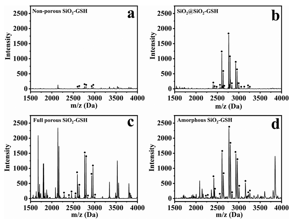 图5.10μg IgG酶解液中糖肽富集效果:(a)非多孔SiO2-GSH;(b)SiO2@SiO2-GSH;(c)全多孔SiO2-GSH;(d)无定形SiO2-GSH。N-糖肽峰用符号“●”标记。