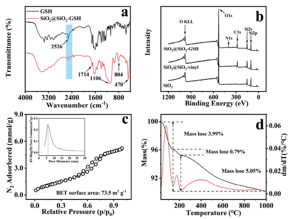图4.(a)GSH和SiO2@SiO2-GSH的FT-IR光谱,(b)SiO2、SiO2@SiO2-vinyl和SiO2@SiO2-GSH的XPS光谱,(c)SiO2@SiO2-GSH的N2吸附-解吸等温线和孔径分布,以及(d)TGA分析结果。