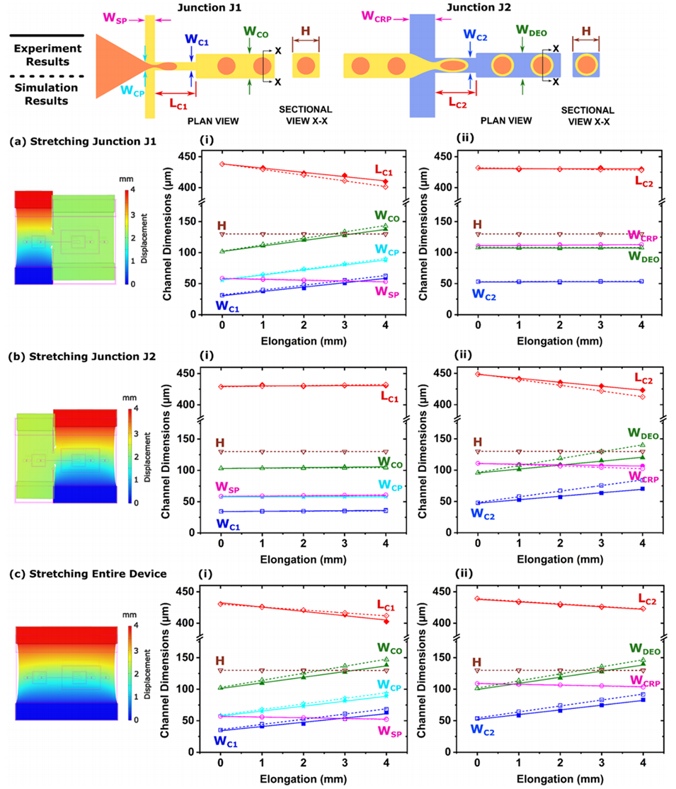 图4.(a)仅拉伸连接1时,J1和J2处关键通道尺寸的变化。(b)仅拉伸连接2时,J1和J2处关键通道尺寸的变化。(c)拉伸整个装置时,J1和J2处关键通道尺寸的变化。