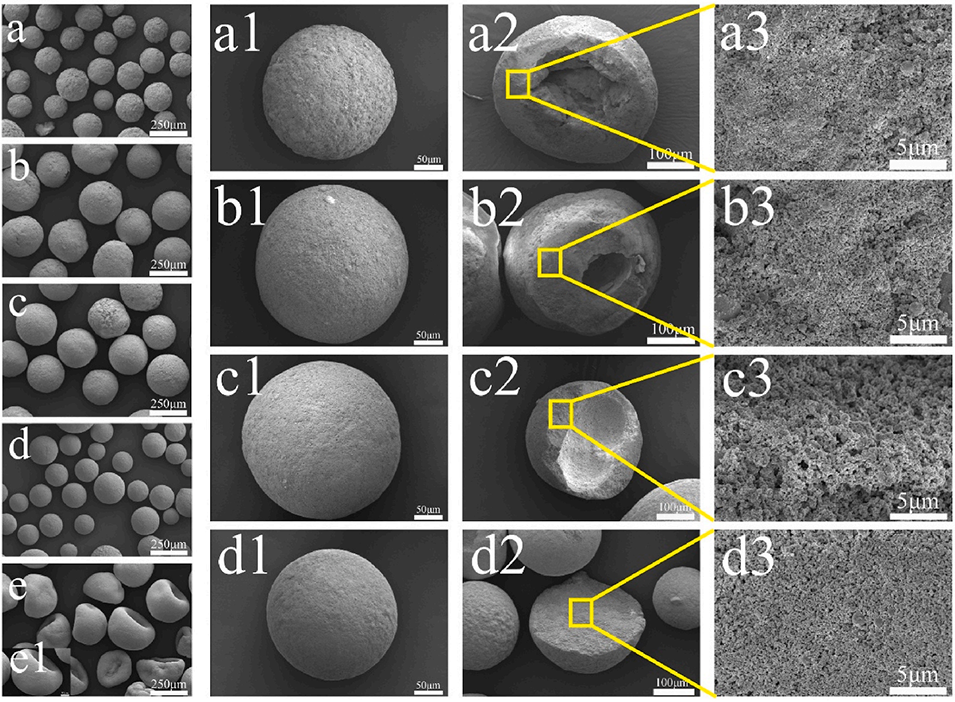图2.不同有机溶剂流速下制备的n-Al/Fe2O3 MICs微球以及实心微球的SEM图:(a)流速为0.1ml/min;(b)流速为0.2ml/min;(c)流速为0.3ml/min;(d)流速为0.2ml/min;(e)流速为0.4ml/min。