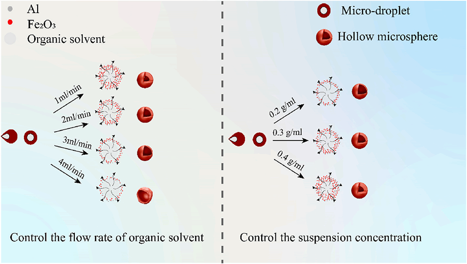 1、本文采用双液滴微流控技术,基于溶剂扩散原理制备了空心结构的n-Al/Fe2O3亚稳态分子间复合物(MICs)微球。