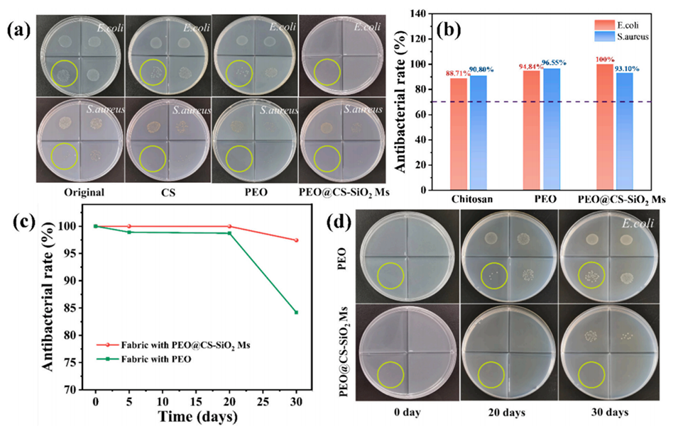 图9.(a)不同稀释度下,大肠杆菌和金黄色葡萄球菌在不同底物上的生长比较;(b)柱状图显示了用壳聚糖或精油处理的对照织物以及含有微胶囊的涂层织物的抗菌率;(c)放置30天后PEO@CS-SiO2微胶囊处理织物和PEO处理对照织物对大肠杆菌的抗菌持久性;(d)不同天数后不同稀释度的大肠杆菌在不同底物上的生长情况。