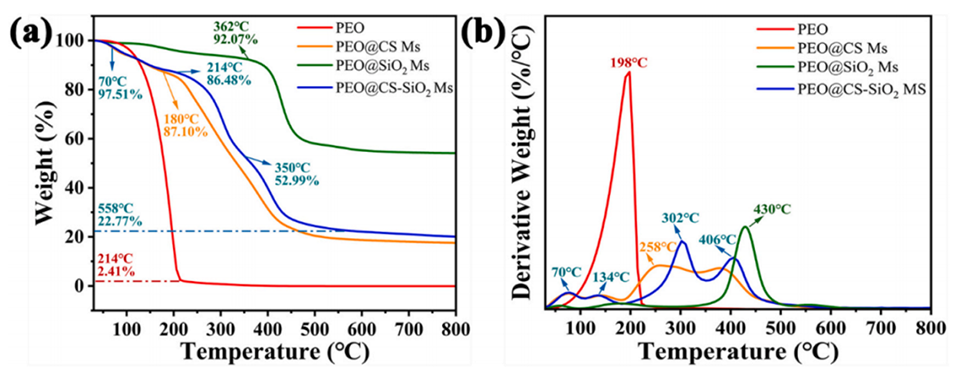 图4.(a)PEO@CS-SiO2、PEO@CS、PEO@SiO2微胶囊和PEO的TGA曲线;(b)PEO@CS-SiO2、PEO@CS、PEO@SiO2微胶囊和PEO的DTG曲线。
