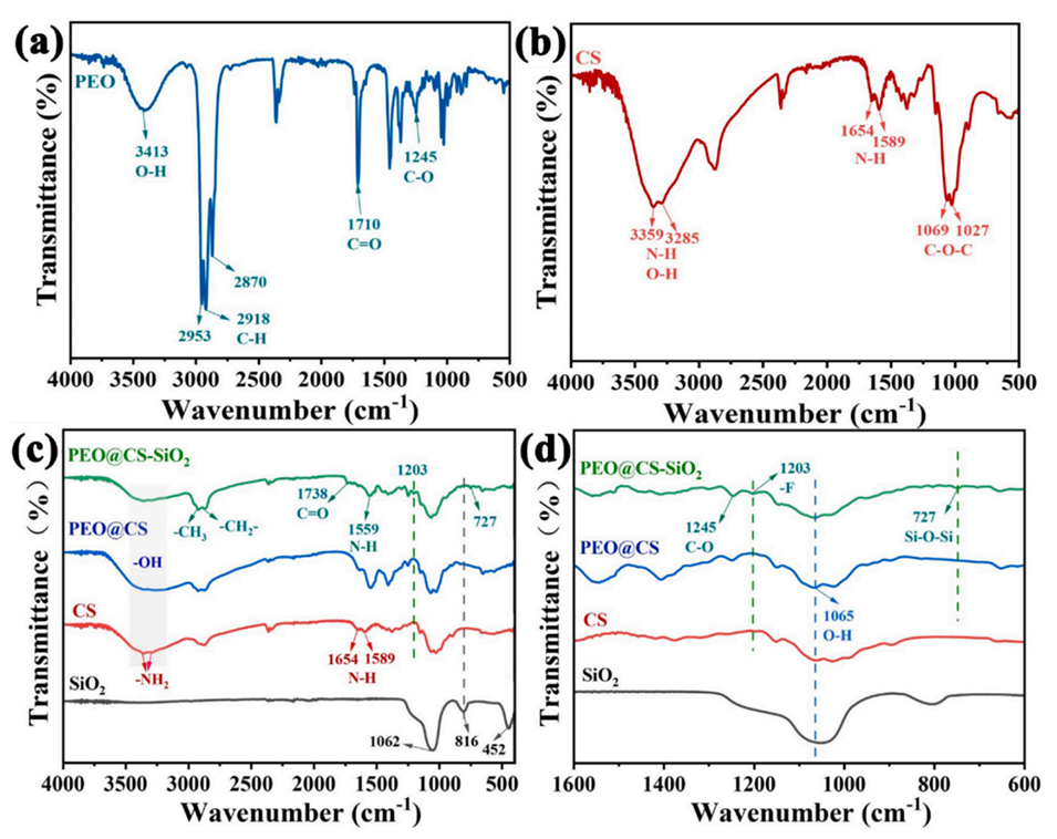 图3.(a,b)PEO和CS的FT-IR光谱;(c,d)SiO2、CS、PEO@CS,以及PEO@CS-SiO2复合微胶囊的FT-IR光谱。