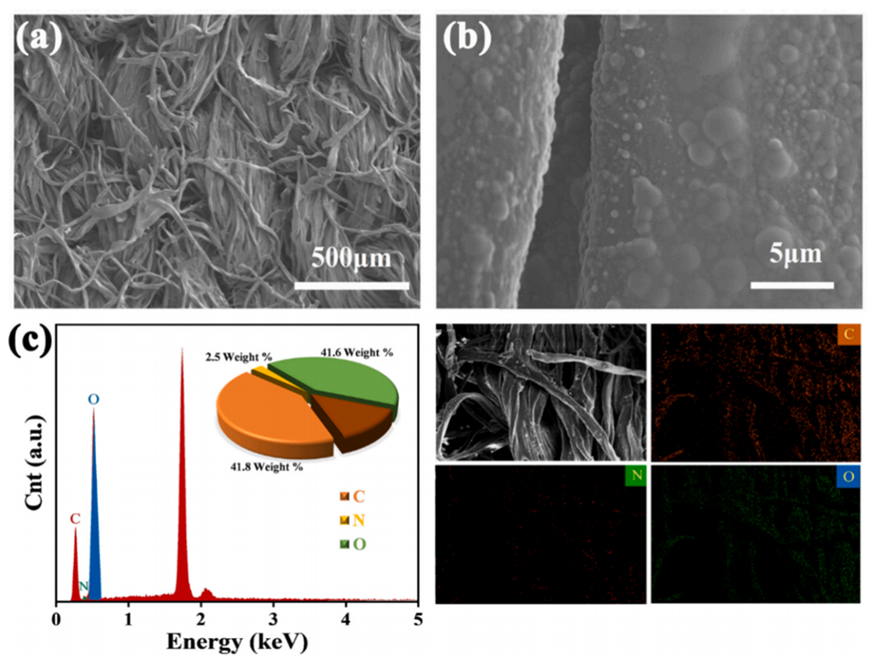 图5.(a)双功能织物涂层的SEM图像;(b)放大的SEM图像;(c)基于PEO@CS-SiO2微胶囊的织物涂层的EDS光谱和相关映射图像。