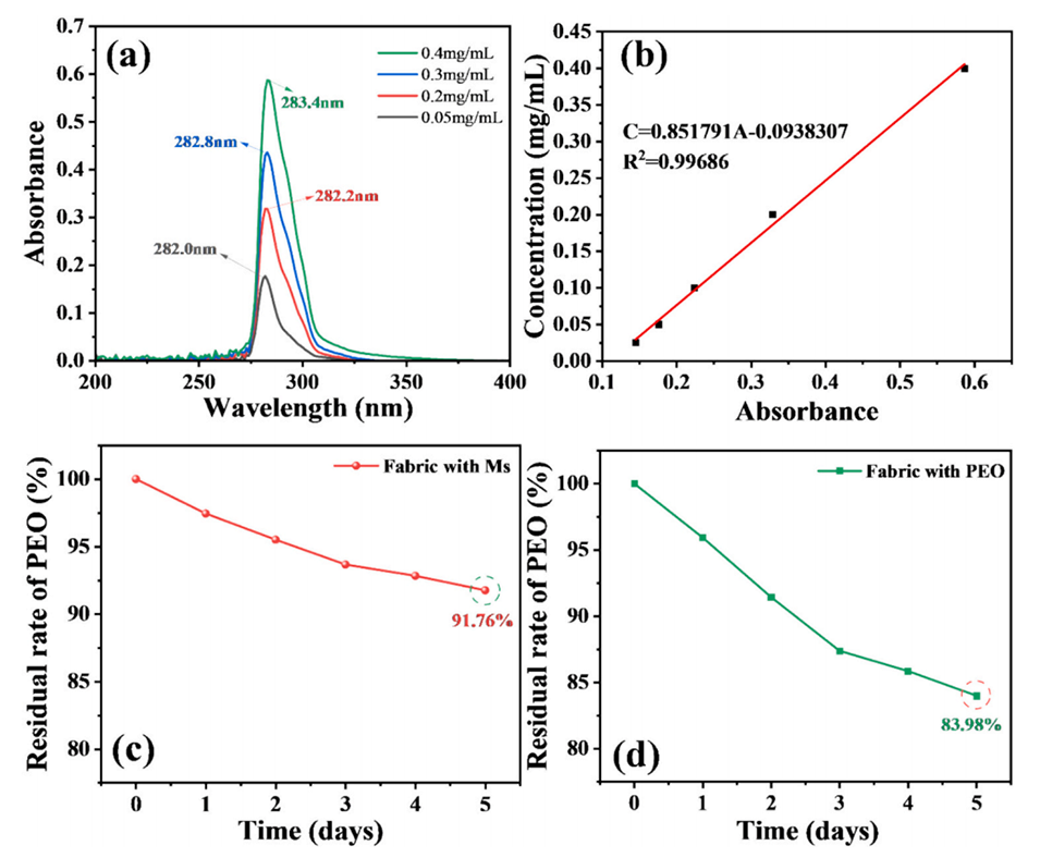 图6.(a)薄荷精油-己烷标准溶液的紫外吸收光谱;(b)薄荷精油-己烷的标准曲线;(c,d)双功能涂层织物和对照织物中PEO残留率随放置时间的变化。