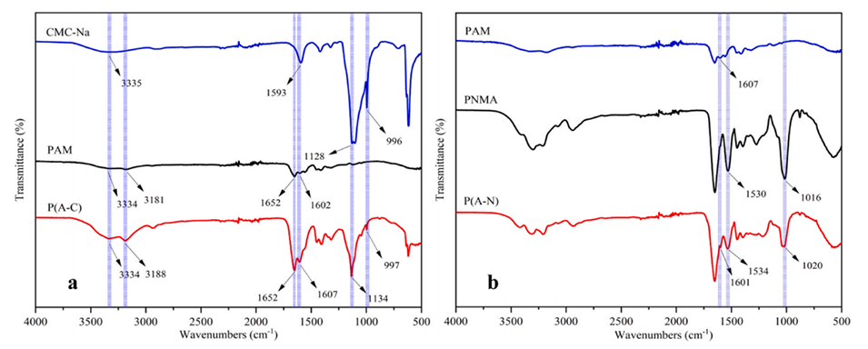 图5.接枝共聚物的FTIR光谱(a:CMC-Na,PAM,P(A-C);b:PAM,PNMA,P(A-N))。