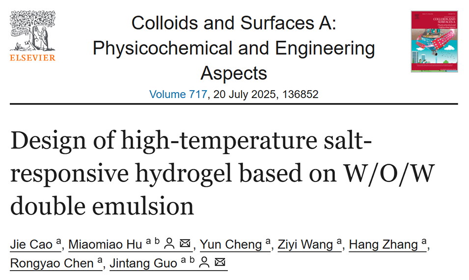 过量的引发剂分解使凝胶化时间难以控制,从而限制了引发聚合物水凝胶在高温、高盐度储层中的应用。近期,天津大学郭锦棠教授、胡苗苗副研究员等人通过构建W/O/W双乳液体系,创新性地利用油相液膜隔离高温引发剂,并结合多羧酸聚合物乳化剂CMC-Na的盐度响应与接枝增强特性,实现了水凝胶在高温(140℃)、高盐(21.8×104 mg/L)地层环境下的可控聚合与机械性能提升。通过微观结构表征与流变学测试验证了双乳液破乳触发机制及硅烷颗粒协同增强效应,为深部碳酸盐岩储层高温高压条件下的流体漏失控制提供了高效解决方案。相关研究以“Design of high-temperature salt-responsive hydrogel based on W/O/W double emulsion”为题发表于期刊《Colloids and Surfaces A: Physicochemical and Engineering Aspects》。