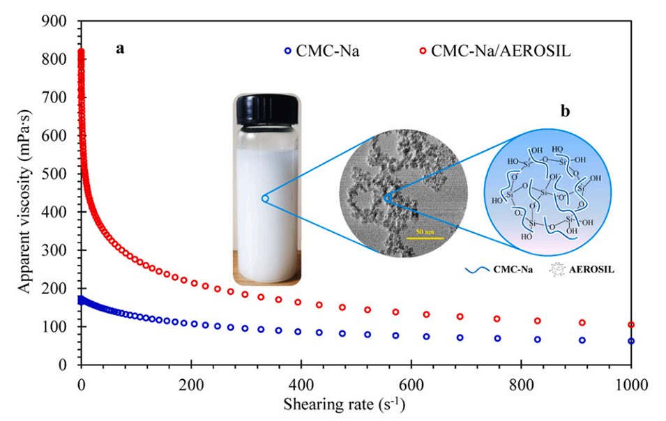 图7.流变性能评价(a:W/O/W双乳液的流变曲线;b:亲水性气相二氧化硅的TEM图像)。