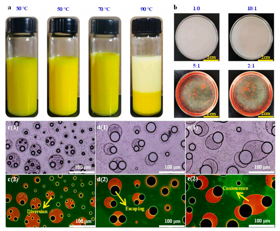 图9.W/O/W双乳液的高温盐度响应过程(a:内部W/O乳液的温度敏感特性;b:外部O/W乳液的盐度响应;c、d和e:W/O/W双乳液在高温盐度响应条件下的微观结构)。
