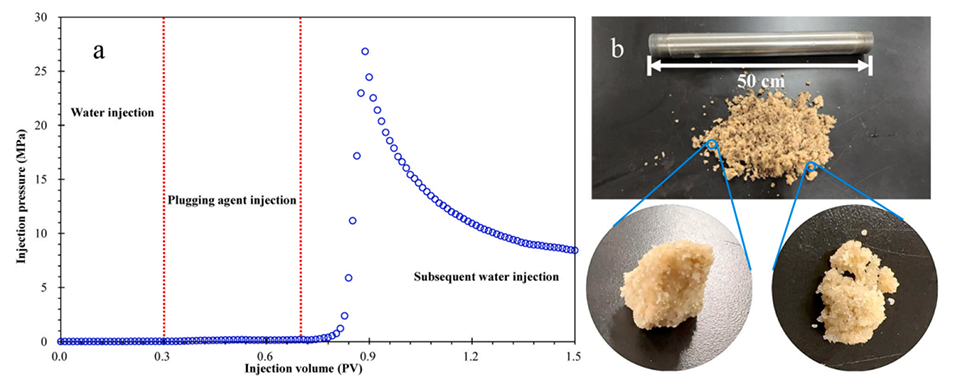 图12.填砂模型堵漏实验(a:注入压力曲线;b:提取后砂的形态)。