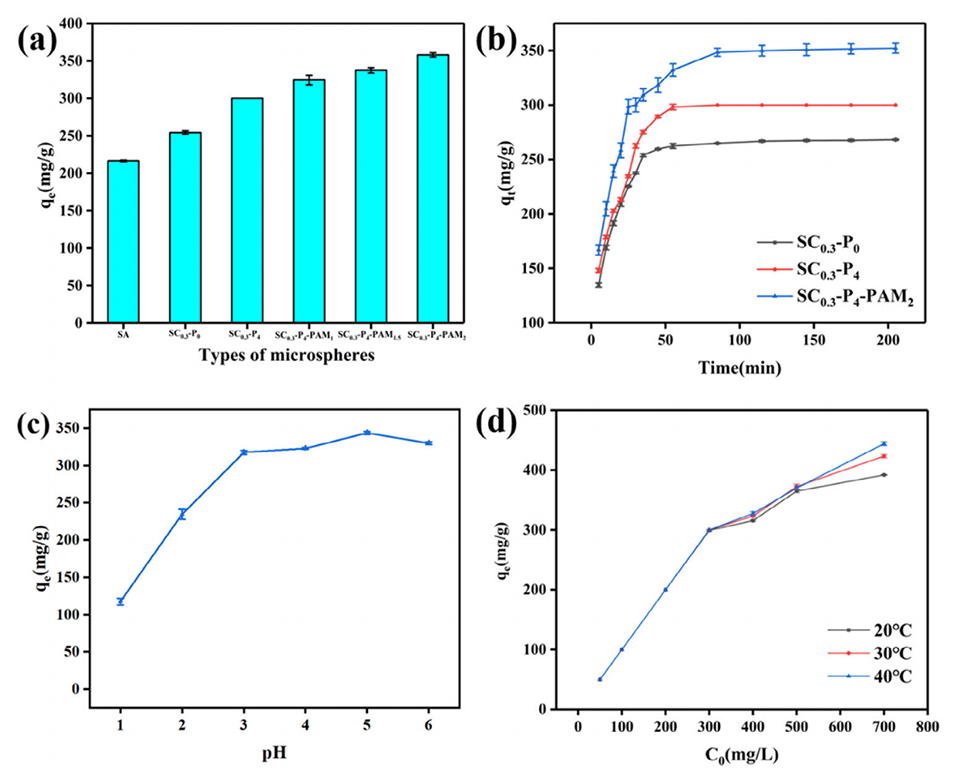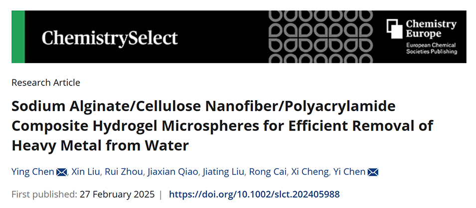 近期,湖南工业大学陈颖副教授、陈一教授等人通过微流控技术制备了一种新型海藻酸钠/纤维素纳米纤维/聚丙烯酰胺(SA/CNF/PAM)复合水凝胶微球,用于高效去除水中的重金属离子。研究显示,该材料在20°C下对Pb2+的吸附容量达676.97 mg/g(基于Langmuir模型),并通过化学吸附机制在pH=5及高盐环境中保持优异性能,同时展现出超过92%的循环再生效率。相关研究以“Sodium Alginate/Cellulose Nanofiber/Polyacrylamide Composite Hydrogel Microspheres for Efficient Removal of Heavy Metal from Water”为题目,发表在期刊《ChemistrySelect》上。