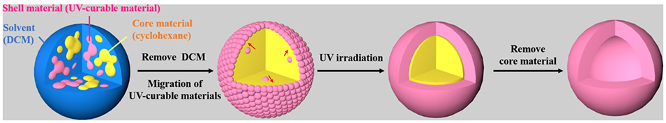 2、该方法以含UV固化材料、光引发剂、环己烷(芯材)和溶剂的油相乳液为原料,通过溶剂挥发诱导相分离,使UV固化材料迁移至油水界面,经紫外固化形成聚合物壳层,最终去除芯材获得空心微球。
