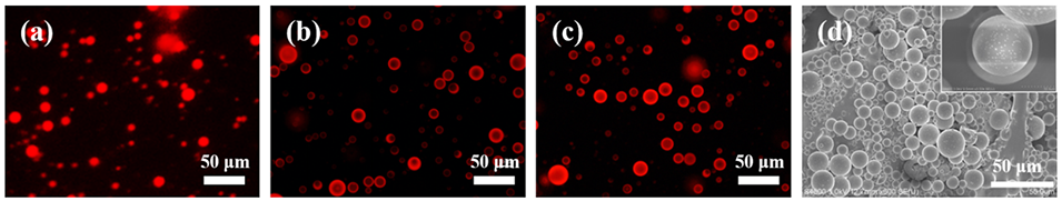 图2.(a)初始乳液液滴、(b)DCM挥发后液滴和(c)紫外线照射后液滴的荧光显微镜图像;(d)辐照后微球的SEM图像。
