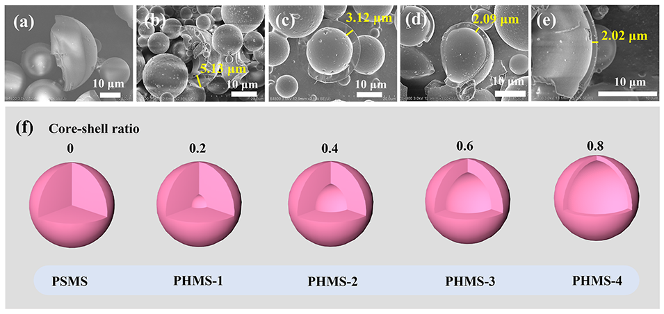 图4.通过不同比例芯材和UV固化材料得到的微球的SEM图像:(a)PSMS,(b)PHMS-1,(c)PHMS-2,(d)PHMS-3和(e)PHMS-4。不同芯材和紫外光固化材料比例的聚合物微球示意图(f):上面的数字是PHMS的核壳比,下面一行是制备的微球,从左到右是PSMS、PHMS-1、PHMS-2、PHMS-3和PHMS-4。
