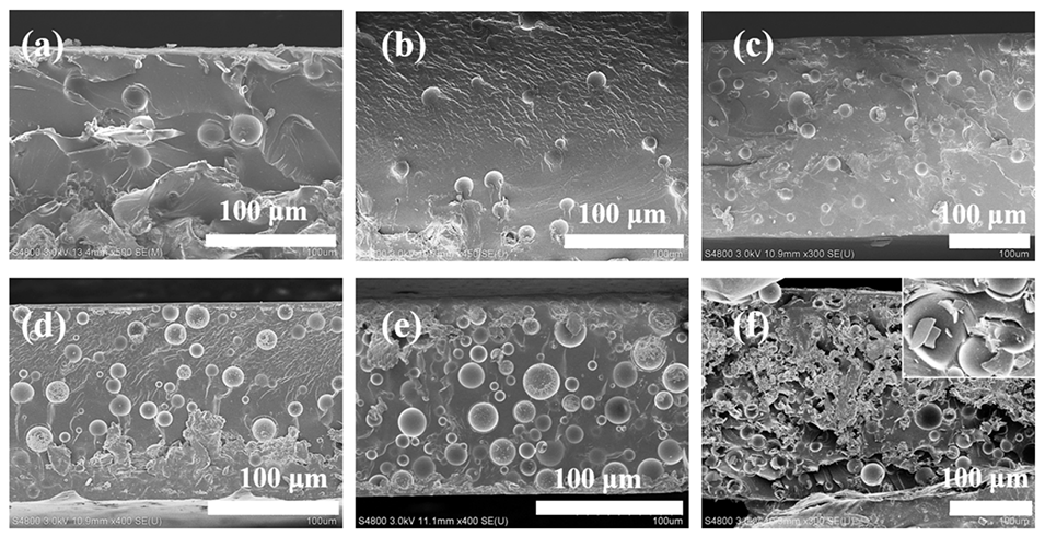 图5.10%浓度下PHMS和HGMs涂层横截面的SEM图像:(a)PSMS,(b)PHMS-1,(c)PHMS-2,(d)PHMS-3,(e)PHMS-4和(f)HGMs。