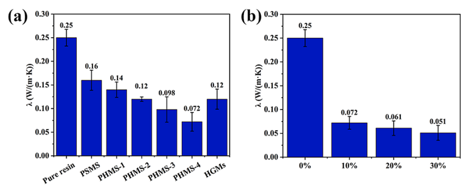 图6.(a)含10%不同核壳比PHMS的涂层的导热系数;(b)含不同浓度PHMS-4微球的涂层的热导率。
