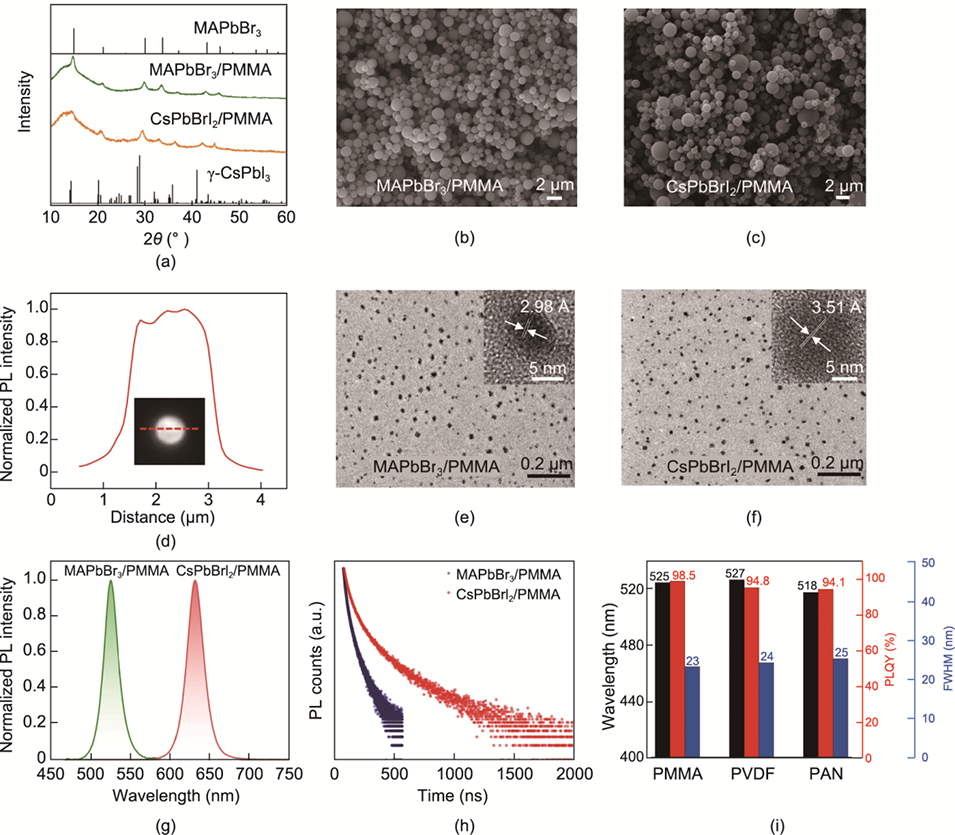 图2.(a)MAPbBr3/PMMA和CsPbBrI2/PMMA PQDs微球的XRD图谱。(b,c)(b)MAPbBr3/PMMA PQD微球和(c)CsPbBrI2/PMMA PQD微球的典型SEM图像。(d)单个~2μm MAPbBr3/PMMA PQD微球在365nm激发下的均匀荧光强度分布。(e)MAPbBr3/PMMA PQD微球的典型TEM图像。插图是典型MAPbBr3 PQD的高分辨率TEM(HRTEM)图像。(f)CsPbBrI2/PMMA PQD微球的典型TEM图像。插图是典型CsPbBrI2 PQD的HRTEM图像。(g)在450nm激发下PLQY大于95%的MAPbBr3/PMMA和CsPbBrI2/PMMA PQD微球的PL光谱。(h)MAPbBr3/PMMA和CsPbBrI2/PMMA PQD微球的PL衰减。(i)通过喷雾干燥法制备的MAPbBr3 PQD嵌入不同聚合物(包括PMMA、PVDF和PAN)的光学性能(波长、PLQY和FWHM)。