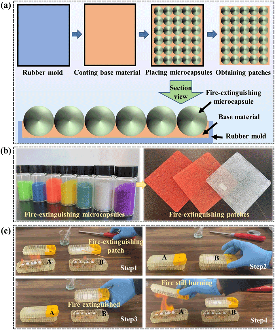 图6:灭火贴片(FEP)的制备与应用全过程。(a):FEP的制备流程,包含多个阶段以获得目标材料。(b):制成的FEMs和FEPs。通过对微胶囊外壳进行染色,可制备出多种颜色的FEMs和FEPs。(c):电器插座中灭火贴片的对比研究。对未贴灭火贴片的插座A和贴有灭火贴片的插座B同时放置点燃的酒精棉模拟火灾场景。结果显示两者差异显著,以此评估FEPs在电器插座场景中的灭火效果。