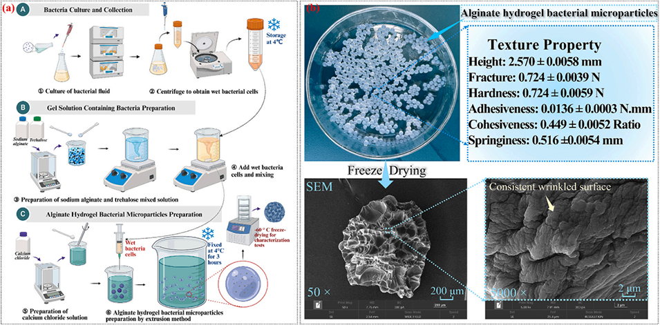 图1.海藻酸钠水凝胶细菌微粒的制备与表征:(a)制备流程,(b)质地与表面形态