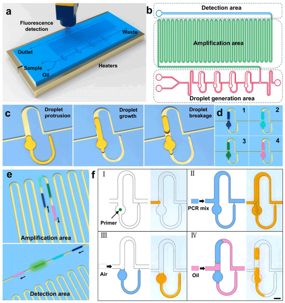 尽管微流控连续流聚合酶链反应(CF-PCR)具有简化热管理和加速传热等优点,但通过CF-PCR处理多个靶标仍然存在挑战,尤其是在空间多路复用方面。将目标样本分割为液滴作为独立反应单元是实现空间多路复用的有效方法。然而,传统液滴生成技术需同时操控油水两相,增加了多目标检测时通道设计和操作的复杂性。
