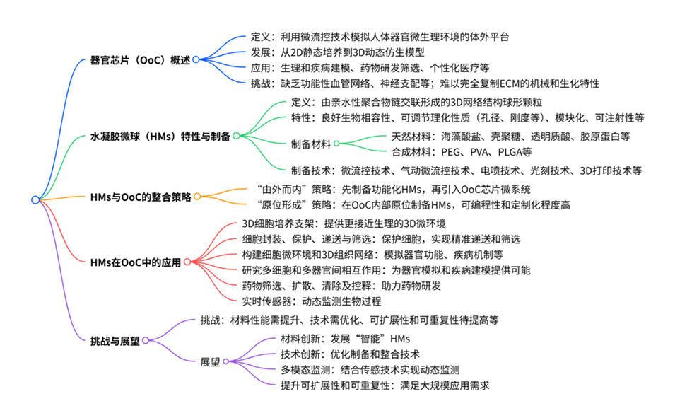 近年来,随着材料科学和制造技术的飞速发展,具有优异生物相容性和可调性能的水凝胶微球(HMs)已成为生物医学研究的重点。HMs可以模拟细胞外基质(ECM)的特性,解决传统OoC系统中缺乏生化和生物物理信号的问题,极大地推动了OoC技术的发展,并赋予其新的能力,如精准模拟细胞生态位微环境、构建复杂的系统模型和三维组织网络、封装和递送靶细胞或治疗剂,以及研究细胞间和器官间串扰等。